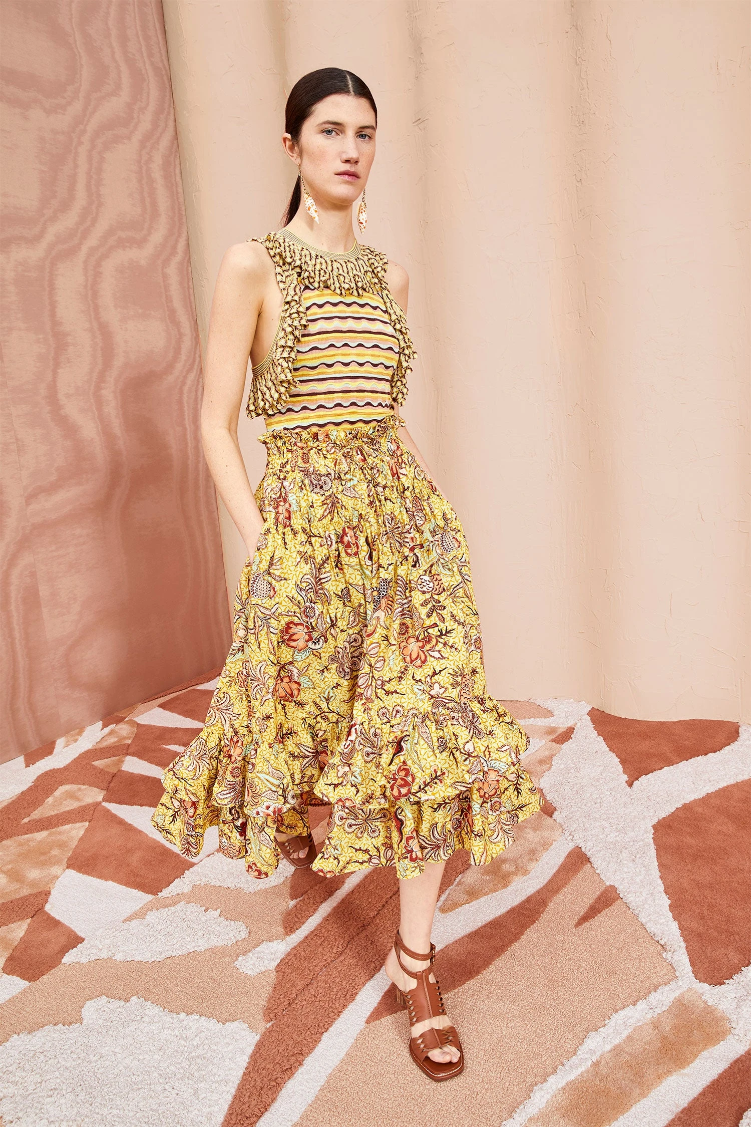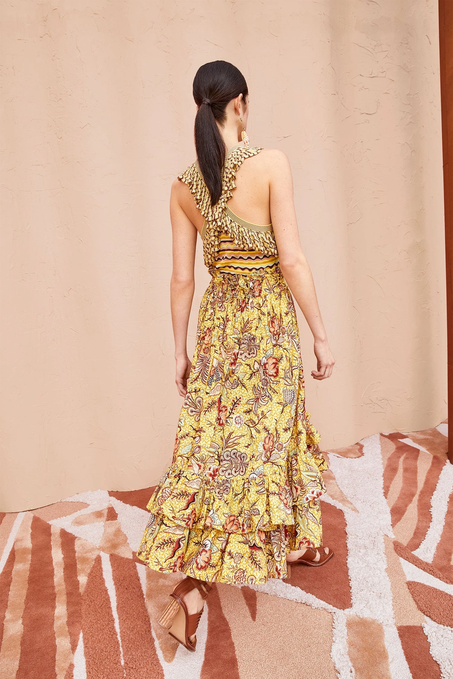 The Acacia skirt, crafted from our wild hibiscus printed poplin, showcases stunning hues of yellow and red. This lightweight maxi skirt is made of pure cotton and boasts a drawstring paperbag waistline, a double-tiered ruffle hem and is finished with side-seam pockets.