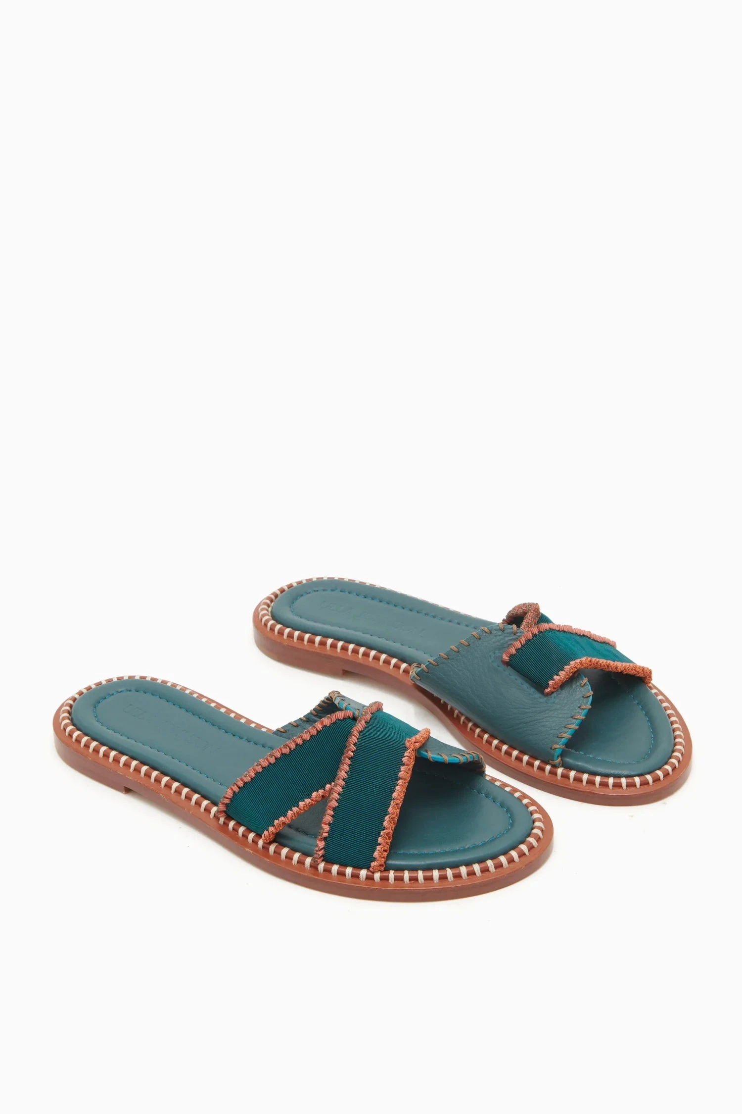 The Ameya Elastic slide is a turquoise sandal crafted from luxurious leather. Defined by its wide elastic strap, this colorful shoe sits on a padded footbed and is finished with contrasting coral stitch detailing.