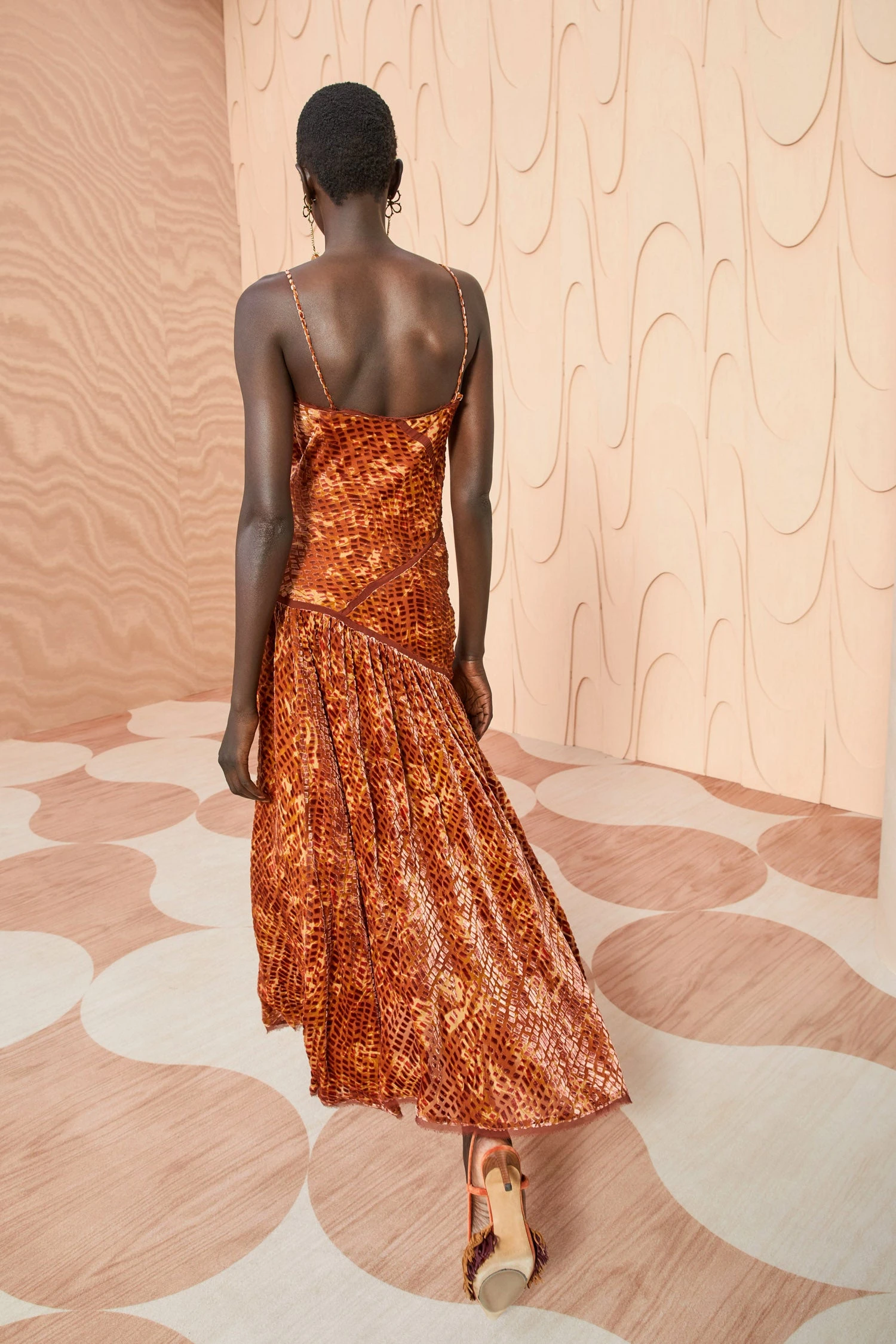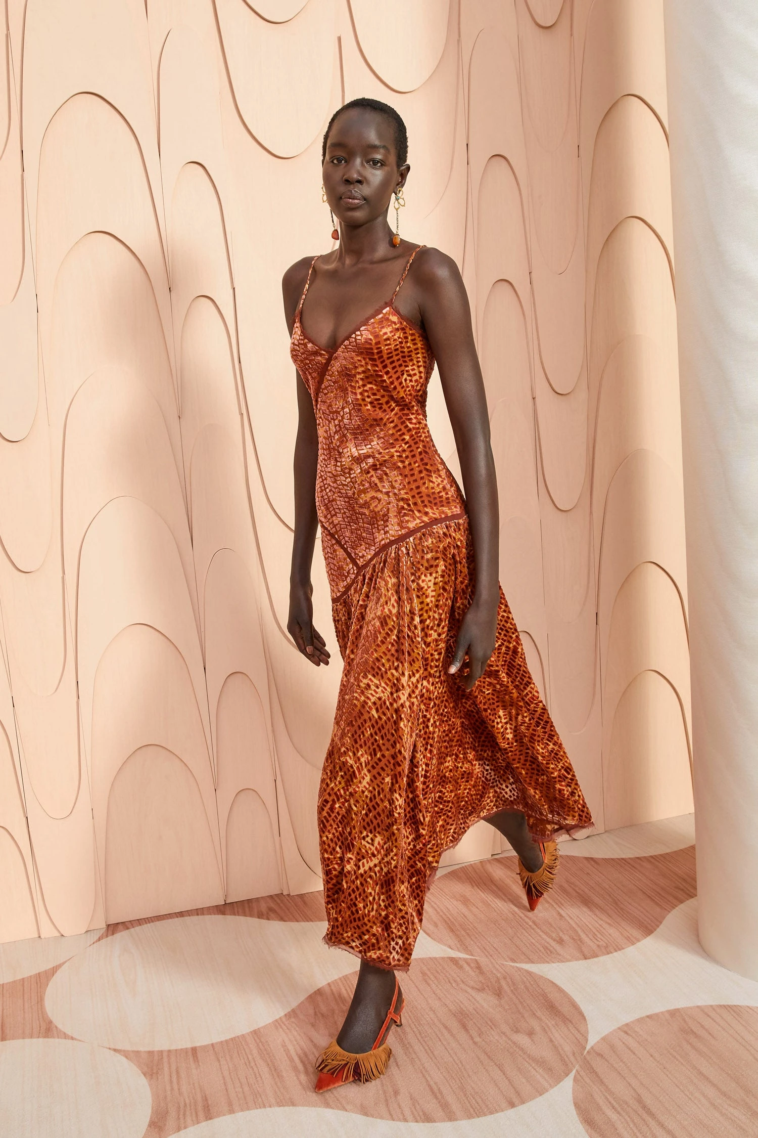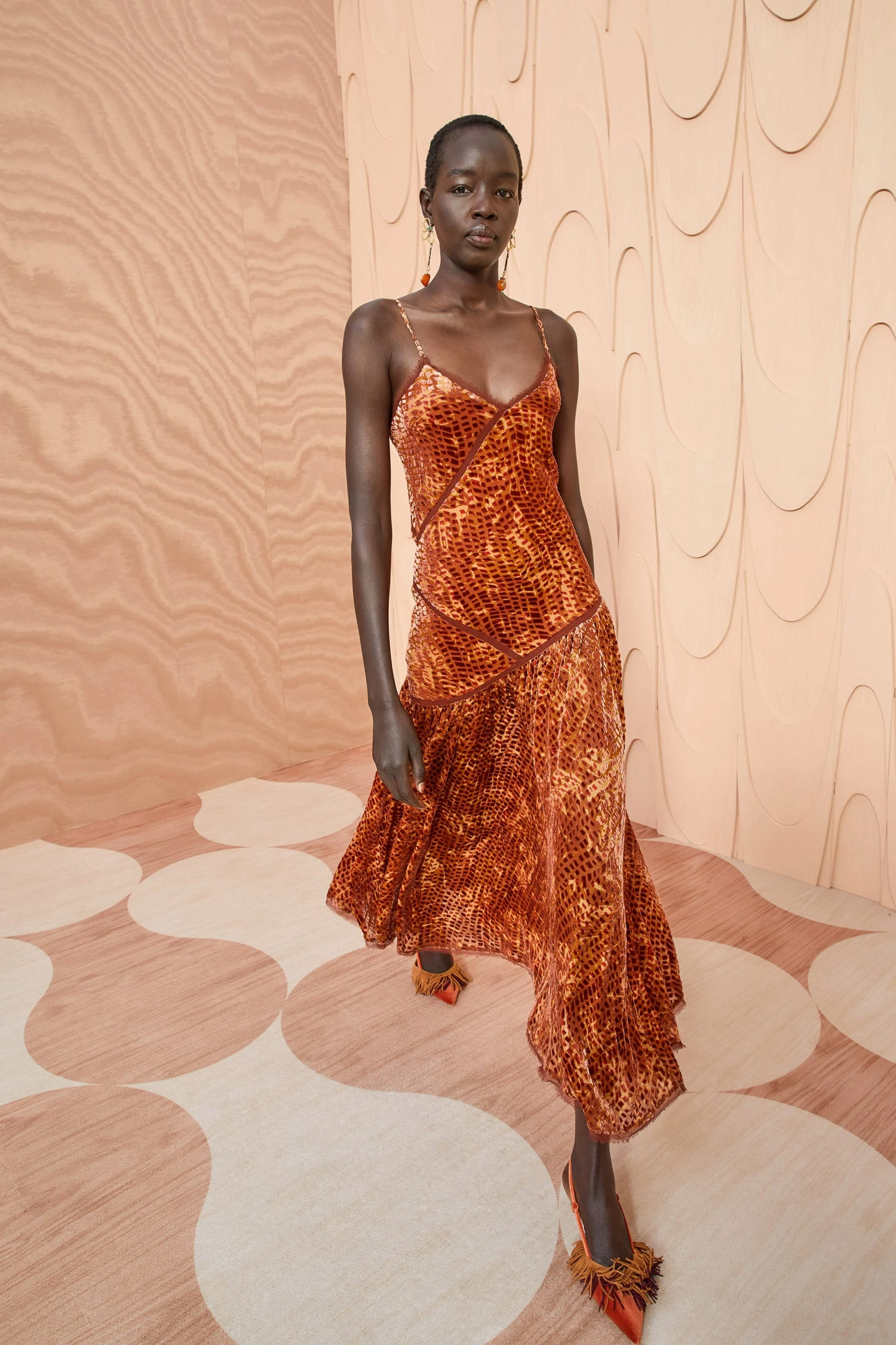 As featured in Look 18 of our Autumn/Winter ’23 Lookbook, the Elodie Dress is made from our velvet devore fabrication—a subtly geometric velvet burnout with a gently swirling moiré pattern. Cut in a body-skimming silhouette, this ’90s-inspired slip dress features chiffon slot seam detailing the asymmetric lines. It is fully lined and fastens with a side-seam zip closure.