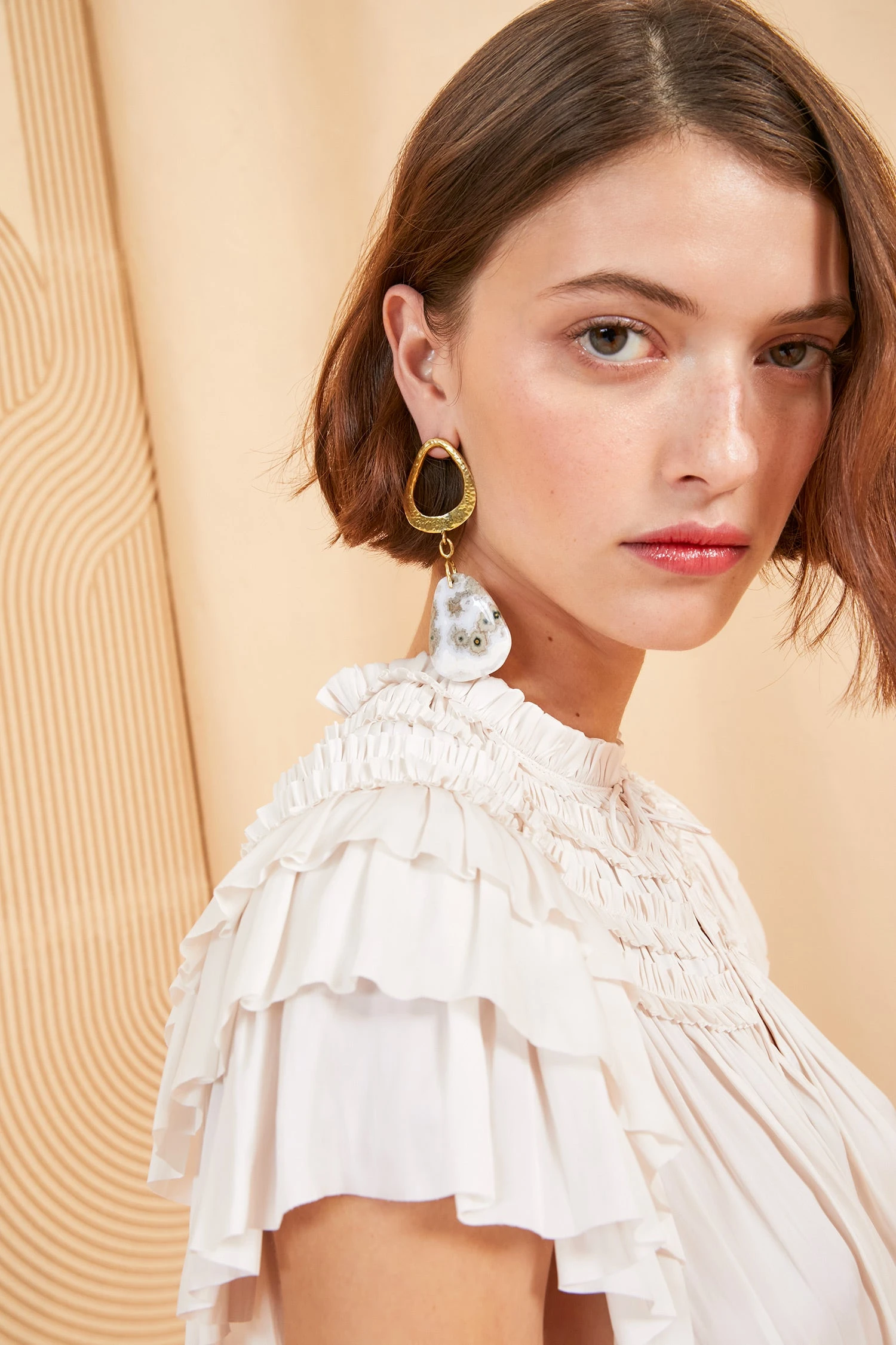 The Eva Top is a simple blouse, richly adorned with romantic details. Mini ruffles frame the neckline, paired with layered flutter sleeves and a loose fitting bodice.
