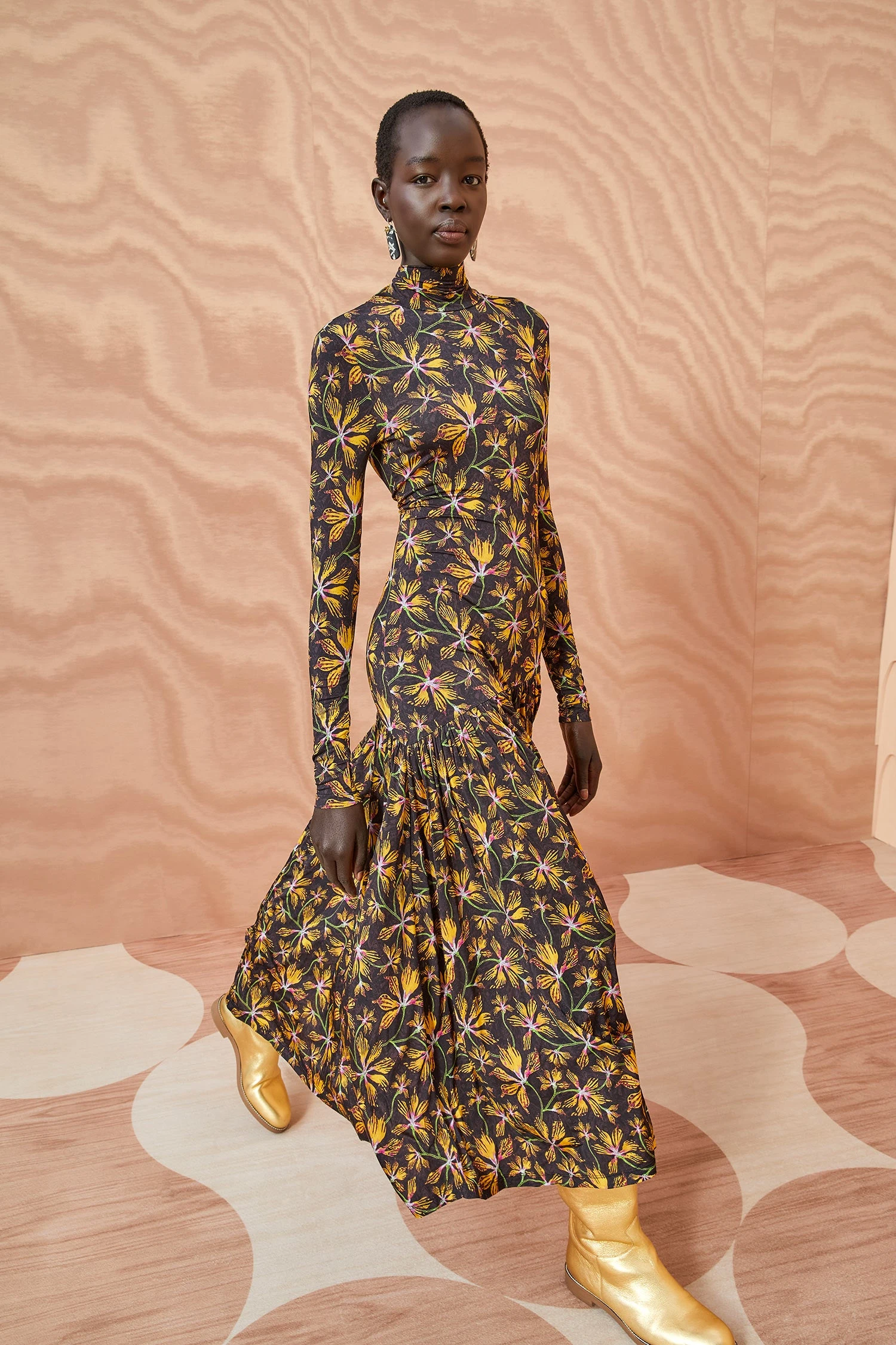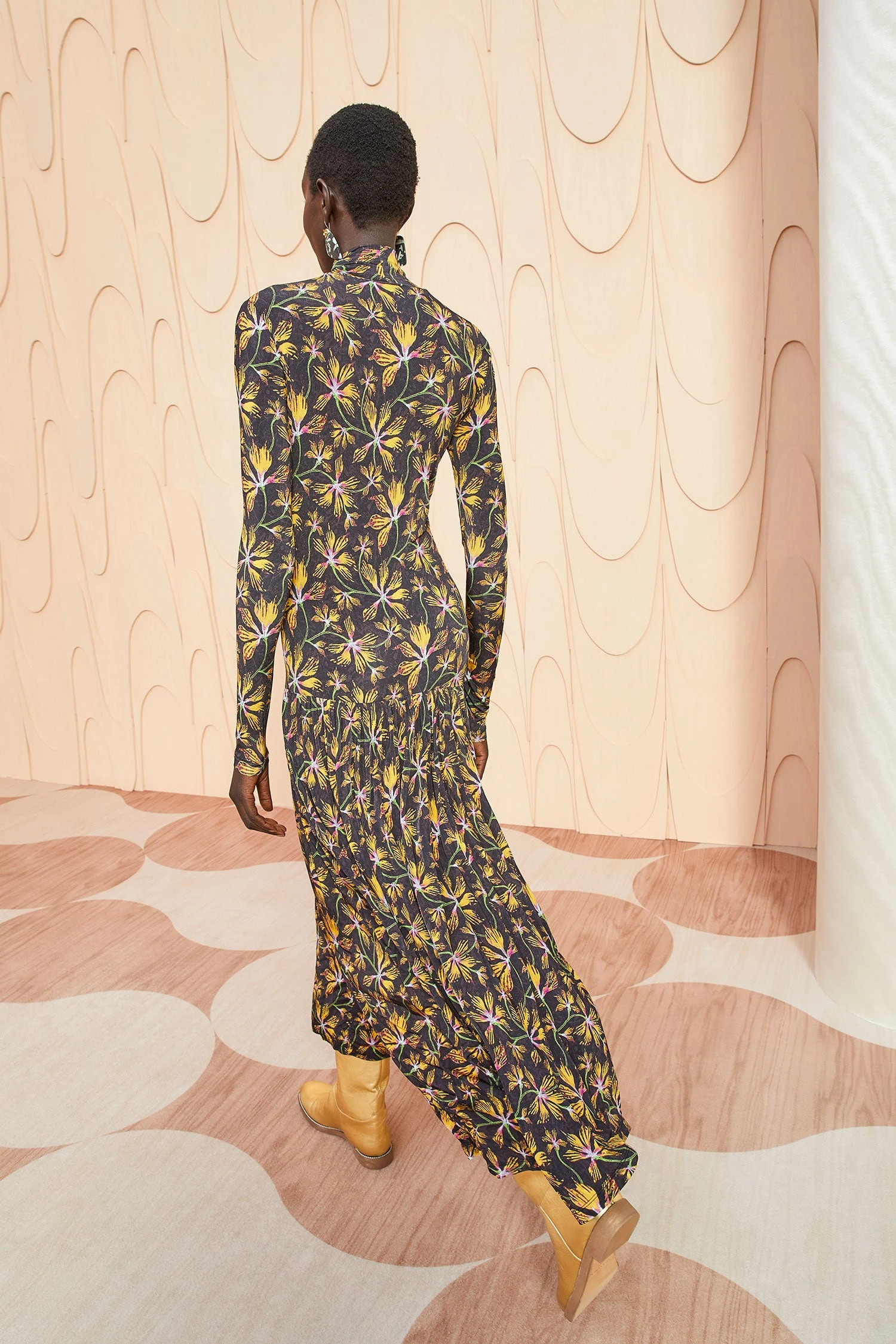 As featured in Look 27 of our Autumn/Winter ’23 Runway Show, the Fernanda Dress is made from our beloved silken tricot jersey—a signature fabrication adorned with vibrant yellow and pink florals. The lightweight jersey allows beautiful drape, designed with a high neckline and asymmetric waistline. It is finished with a midi-length hem.