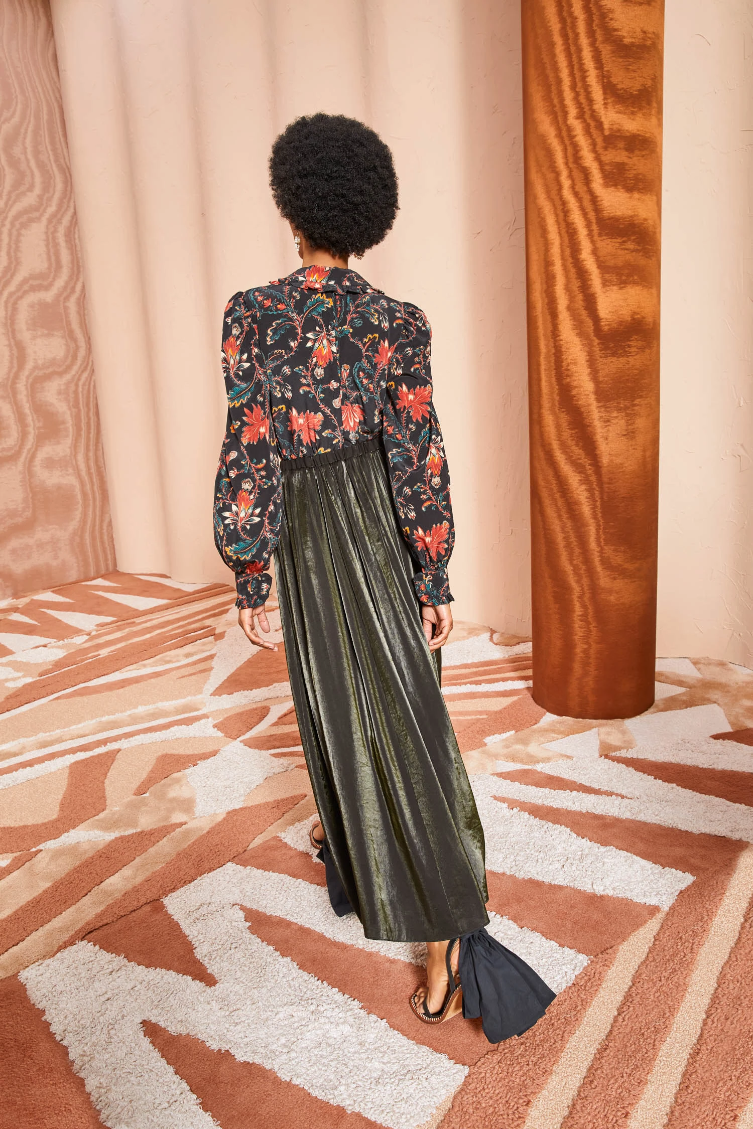 The Irvette Skirt is crafted from iridescent Italian satin in a classic black hue. This gleaming silhouette features a maxi-length skirt that’s gathered at the waist to create a beautiful ripple effect. Finished with shiny brass hardware at the waist and a ribbon tie belt.