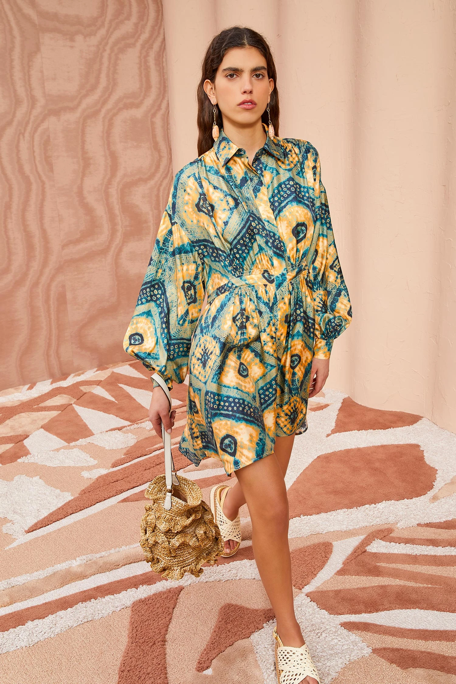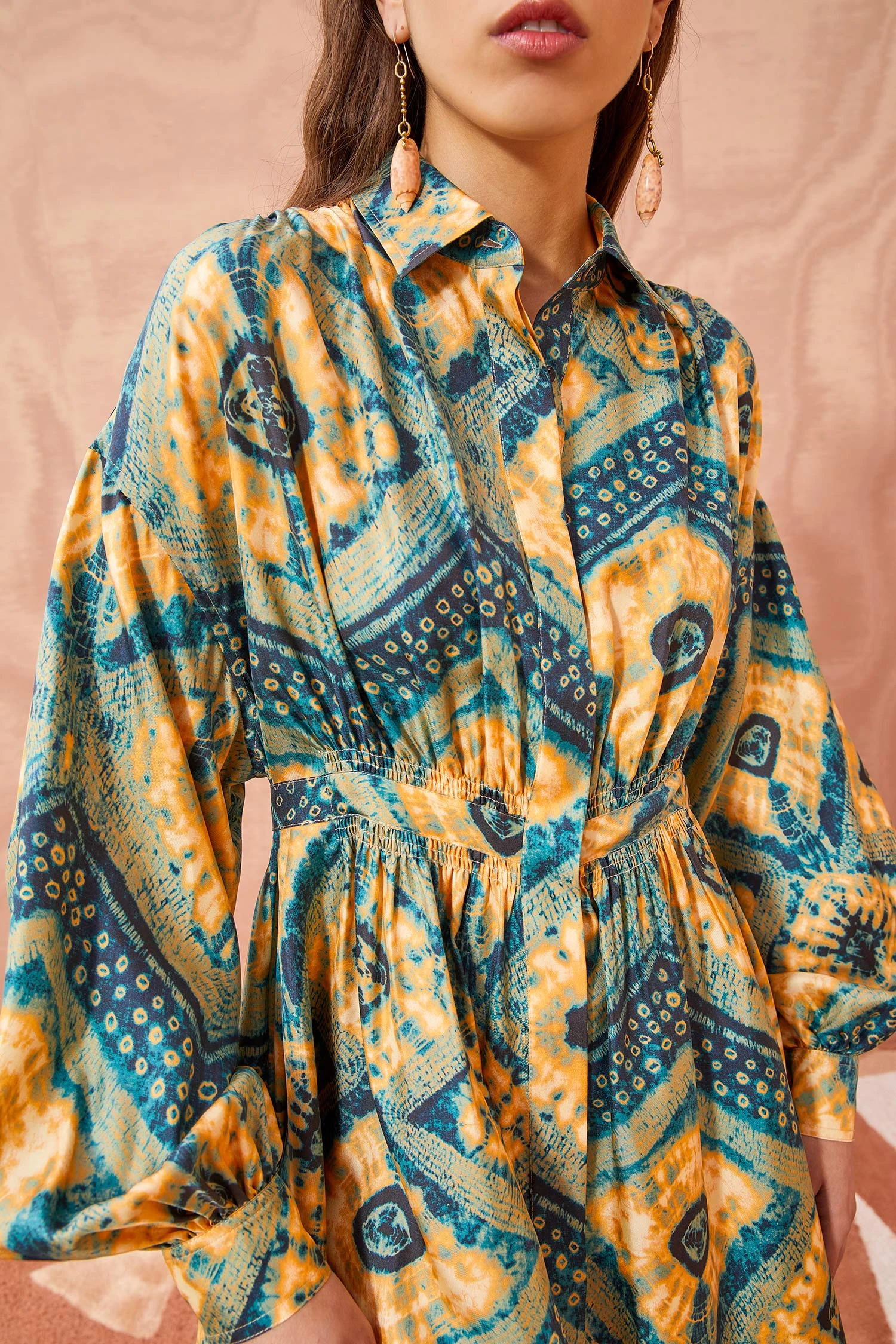 The Jude Dress is an oversized shirt dress crafted from our digitally printed diamond shibori silk twill. This slouchy yellow and blue mini dress features billowing sleeves and a covered button panel. Finished with a waist tie that can cinch the waistline or be left open for a loose and flowy look.