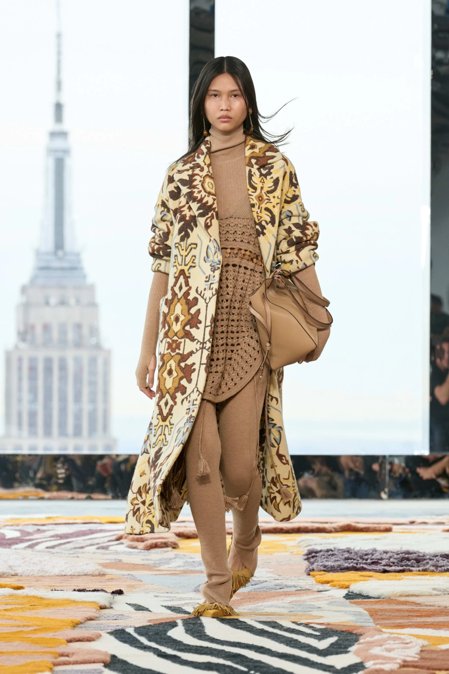 As featured in Look 29 of our Autumn/Winter ’23 Runway Show, the Juliana Coat is offered exclusively through Ulla Johnson, and crafted from a luxurious blend of Italian-made wool and cashmere. This graphic yet traditional print features vivid yellow, brown, and blue hues. It is finished with exaggerated lapels, a removable belt, and tonal buttons.