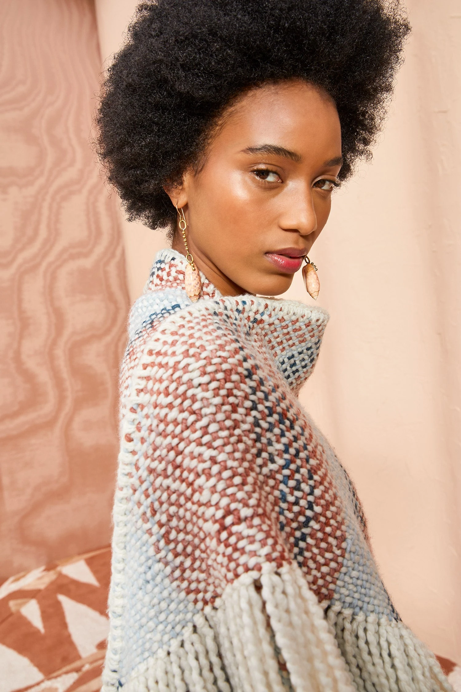 The Martina Shawl is lovingly handcrafted by our long-time artisanal partners, Manos Del Uruguay, using a soft midweight cotton yarn. This knit shawl features a mélange of cream, red, and blue hues, and is a cozy wrap-around silhouette that can be worn several different ways. Finished with a natural fringe hem.