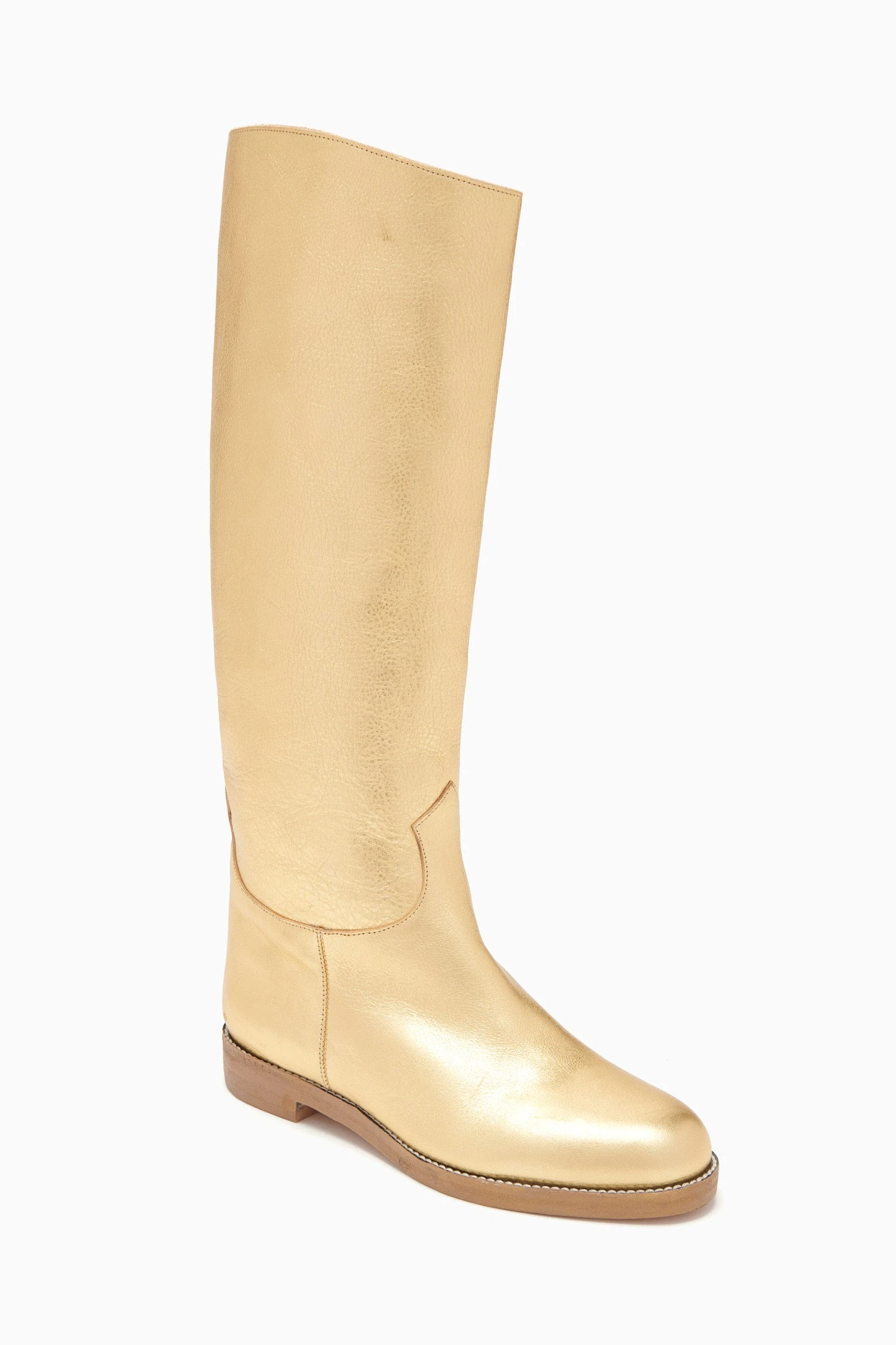 The Ninia Riding Boot is made from metallic leather in an eye-catching golden hue. Designed with comfort and style in mind, these boots have a curved silhouette with an asymmetrical topline and rest on a slight heel.