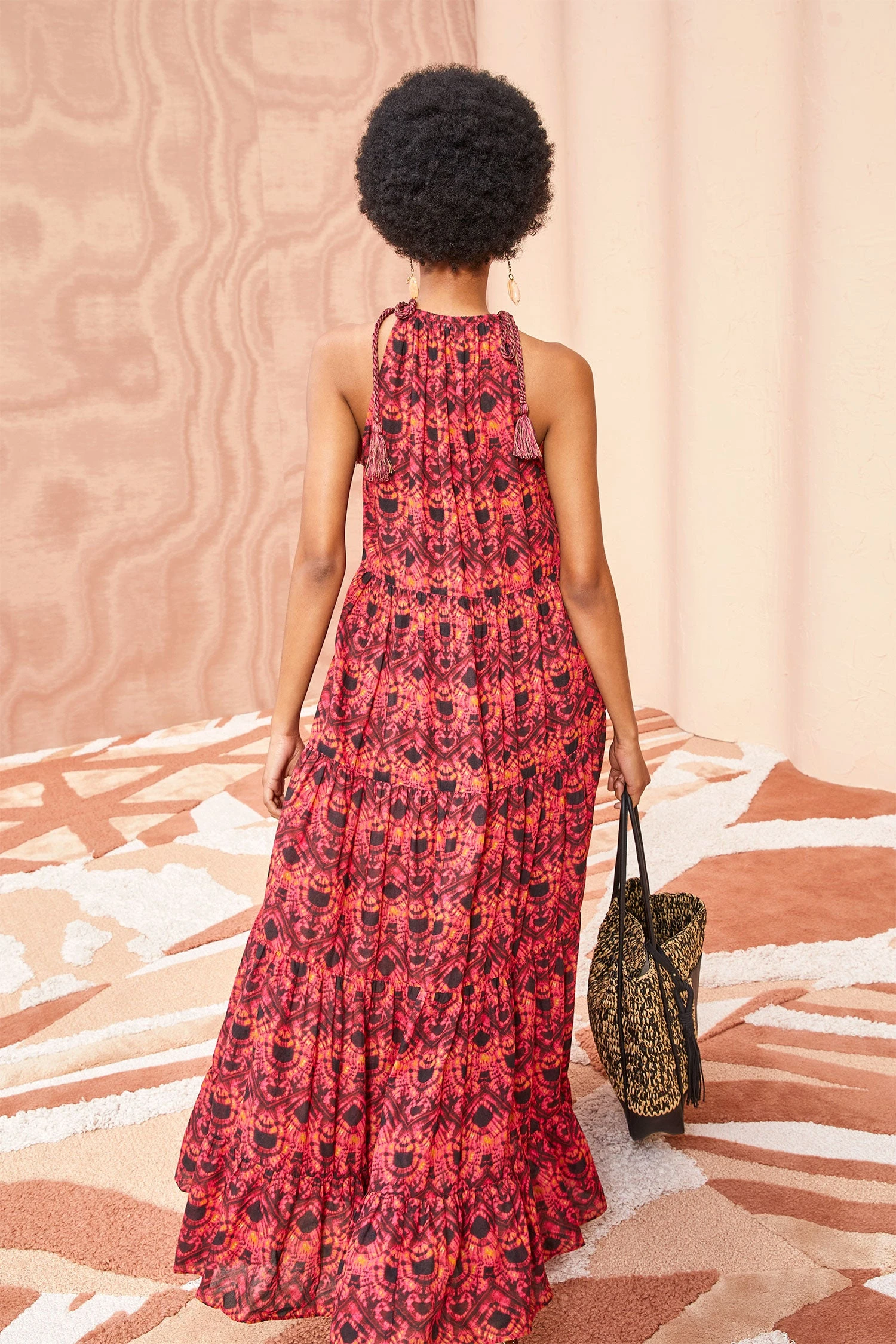 The Ottavia Coverup is a full-length coverup crafted in a lightweight cotton blend. This tiered sleeveless dress is cut in a dark pink prismatic print and is defined by its high neckline, which is finished with tasseled rope ties at the shoulders.