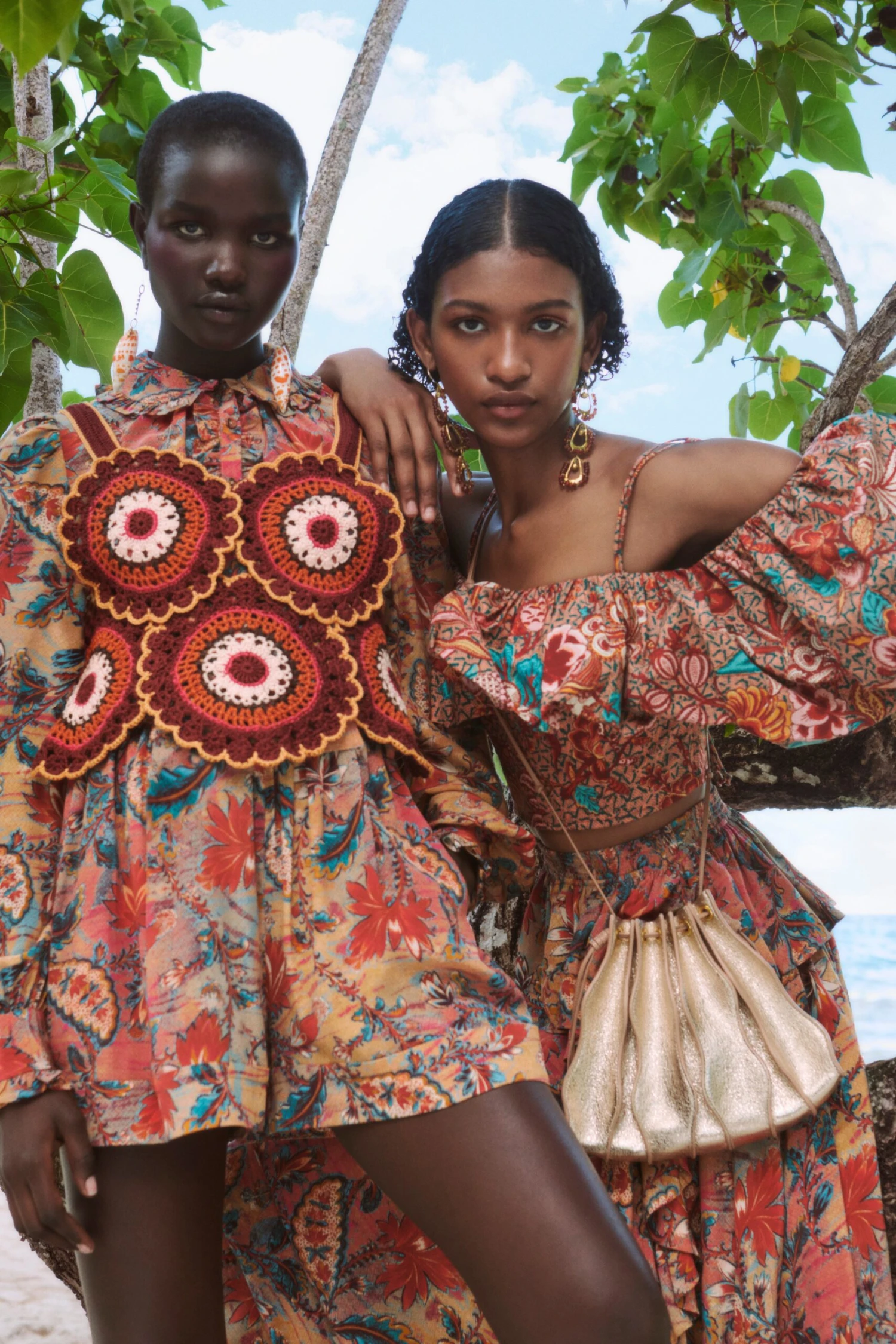 As featured in Look 5 of our Pre-Fall ’23 Lookbook, the Ursa Skirt is a romantic silhouette crafted from our blooming paisley crepe de chine, a lightweight silk adorned with cascading ruffles and gathered seams. This orange, red and blue floral skirt features a fixed waist, peplum hem, and a side slit framed by a ruffle that falls to the hemline.